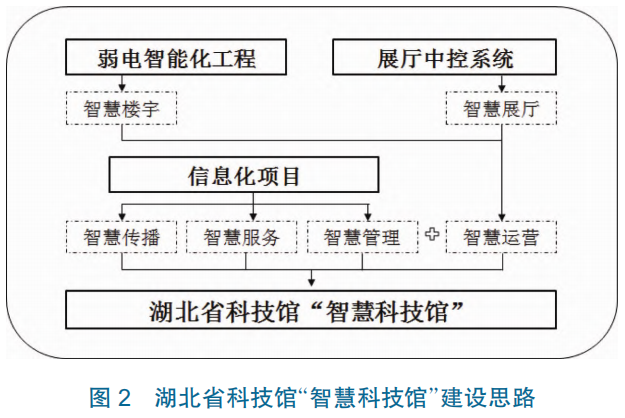 智慧科技馆的建设仍处在起步阶段,智慧传播、智慧服务、智慧运营、智慧管理也仅仅是基于 5G 应用场景和其他智慧场馆的建设实践和设计方案而做出的构思和整体设计。随着 5G、AI、大数据、物联网应用的不断进化,智慧科技馆的未来发展也许会出乎所有人的预料。湖北省科技馆新馆建设正处在智慧科技馆的起步时期,作为省级大馆,有义务也有意愿对智慧科技馆建设实践做一些尝试。湖北省科技馆新馆由湖北省发改委于 2013 年月批复立项,总用地面积约 19.4 万 m2 ,主体建筑面积 7.03 万 m2,展示面积约 4 万 m2,常设展厅总面积约 1.6 万 m(2 不含专题展厅),其中二层展厅面积3 298m2,三层展厅面积 12 730 m2 ,共设置展品 525个,其中二层展品 75 个,三层展品 450 个,总概算约11.88 亿元。湖北省科技馆新馆“智慧科技馆”建设大体上经历了土建工程的弱电智能化工程建设、展教工程的展厅中控系统建设、开馆运营前期的信息化项目建设三个阶段,分别从智慧楼宇、智慧展厅、智慧传播、服务与管理四个方面完成了智慧科技馆的整体设计与建设(见图 2)。